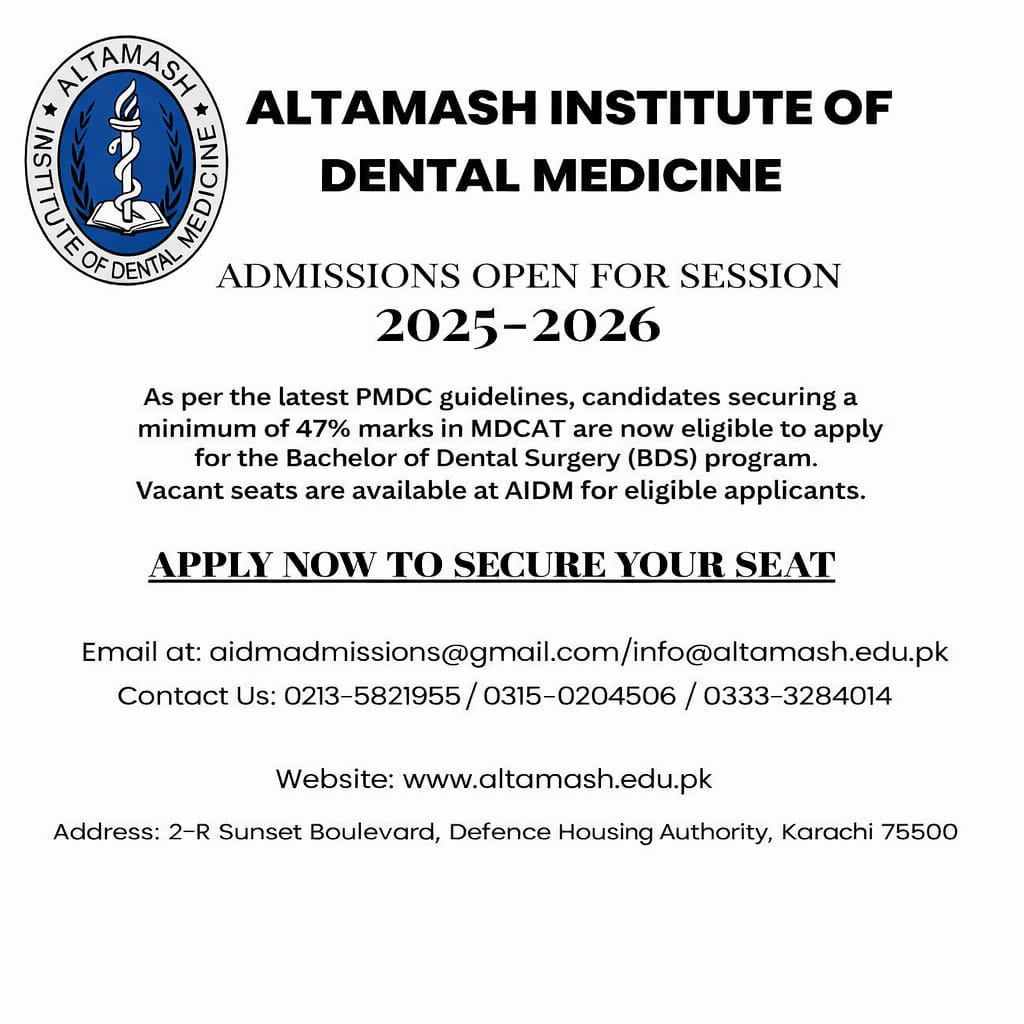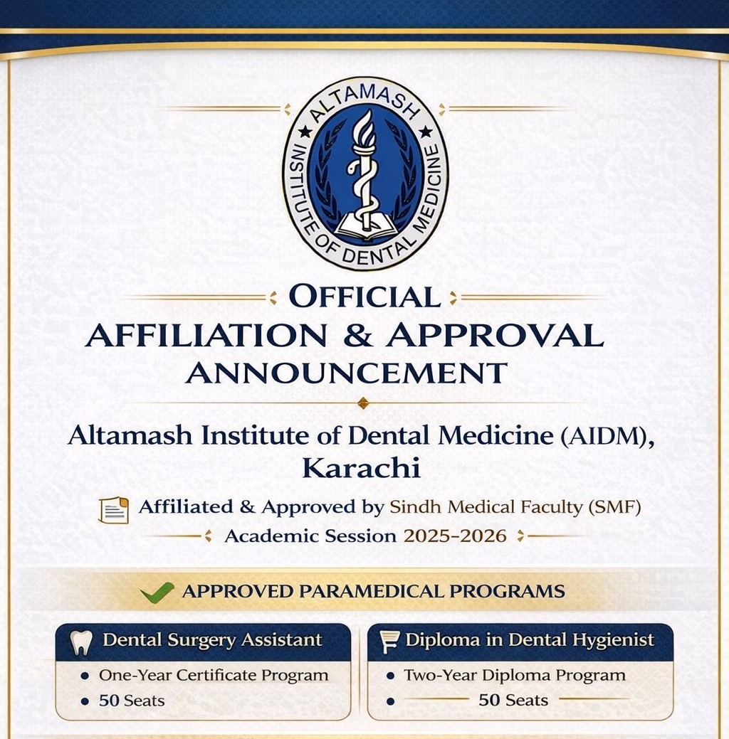 Altamash Institute of Dental Medicine (AIDM) is well known as a leading source for dental education and Best Dental College in Karachi the achievements and contributions of AIDM are recognized in Pakistan and abroad both as an institution and as a dental hospital. (AIDM) was established in 2000 and has since its inception stood out as an exemplary place for undergraduate, postgraduate, research programs, foreign collaboration, and student teacher exchange programs. AIDM is a blend of a committed and qualified faculty inherently focused to provide high-quality theoretical and practical knowledge to its devoted students in a well-enabled environment.
