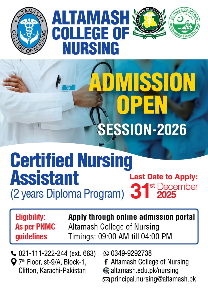 Altamash College of Nursing aspires to become apinnacle of excellence in nursing education, dedicated to nurturing dedicated,proficient, and empathetic healthcare professionals who exhibit a world-classstandard in nursing education, research, and patient care
